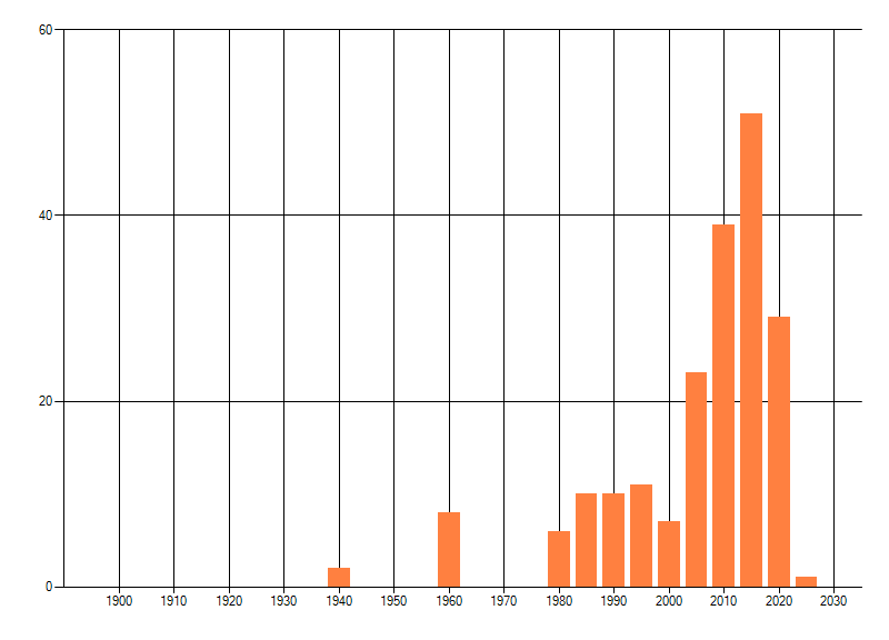 Het aantal atlasblokken (5x5 km) waarin de soort is gemeld binnen een periode van vijf jaar (vanaf 1980) of twintig jaar. Niet gecorrigeerd voor waarnemersinspanning en het aantal doorgegeven waarnemingen kan sterk variëren per periode, dus een trend in verspreiding kan hier niet direct uit worden afgelezen. Het opgegeven jaartal is het eerste jaar van de periode. Bron: gevalideerde waarnemingen uit de NDFF.