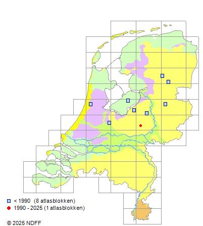 Het aantal atlasblokken (5x5 km) waarin de soort is gemeld binnen een periode van vijf jaar (vanaf 1980) of twintig jaar. Niet gecorrigeerd voor waarnemersinspanning en het aantal doorgegeven waarnemingen kan sterk variëren per periode, dus een trend in verspreiding kan hier niet direct uit worden afgelezen. Het opgegeven jaartal is het eerste jaar van de periode. Bron: gevalideerde waarnemingen uit de NDFF.