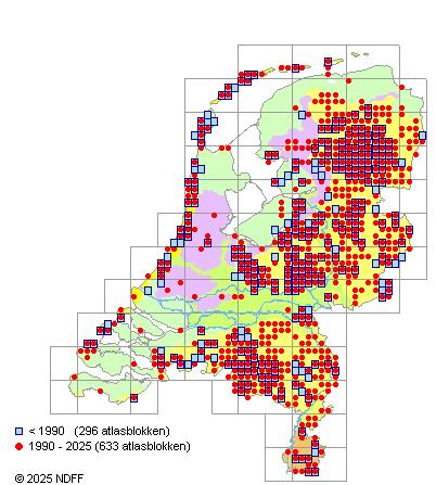 Het aantal atlasblokken (5x5 km) waarin de soort is gemeld binnen een periode van vijf jaar (vanaf 1980) of twintig jaar. Niet gecorrigeerd voor waarnemersinspanning en het aantal doorgegeven waarnemingen kan sterk variëren per periode, dus een trend in verspreiding kan hier niet direct uit worden afgelezen. Het opgegeven jaartal is het eerste jaar van de periode. Bron: gevalideerde waarnemingen uit de NDFF.