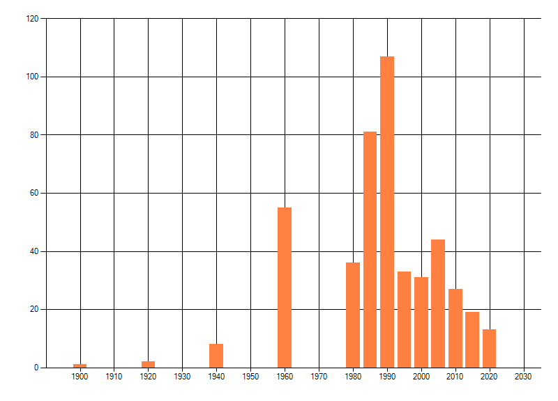 Het aantal atlasblokken (5x5 km) waarin de soort is gemeld binnen een periode van vijf jaar (vanaf 1980) of twintig jaar. Niet gecorrigeerd voor waarnemersinspanning en het aantal doorgegeven waarnemingen kan sterk variëren per periode, dus een trend in verspreiding kan hier niet direct uit worden afgelezen. Het opgegeven jaartal is het eerste jaar van de periode. Bron: gevalideerde waarnemingen uit de NDFF.
