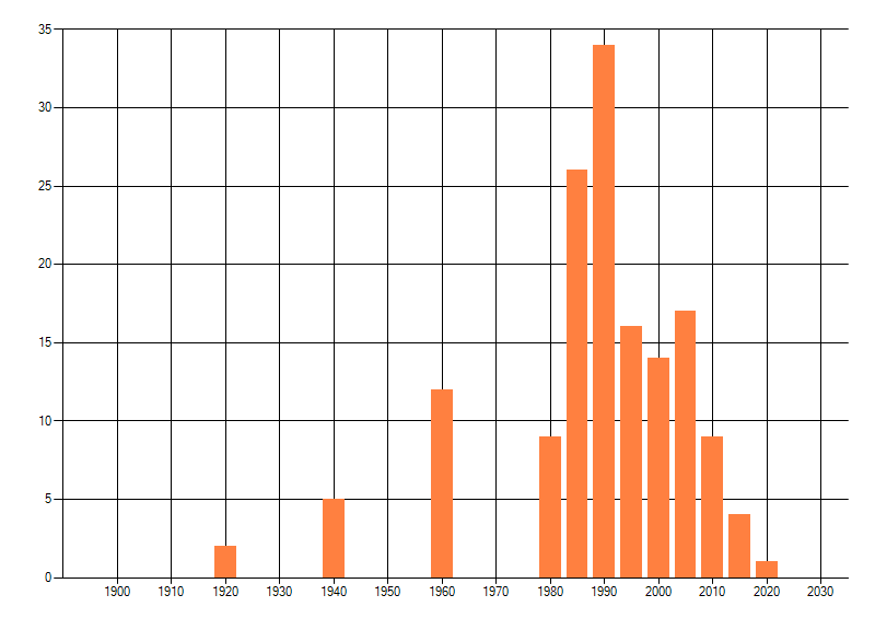 Het aantal atlasblokken (5x5 km) waarin de soort is gemeld binnen een periode van vijf jaar (vanaf 1980) of twintig jaar. Niet gecorrigeerd voor waarnemersinspanning en het aantal doorgegeven waarnemingen kan sterk variëren per periode, dus een trend in verspreiding kan hier niet direct uit worden afgelezen. Het opgegeven jaartal is het eerste jaar van de periode. Bron: gevalideerde waarnemingen uit de NDFF.