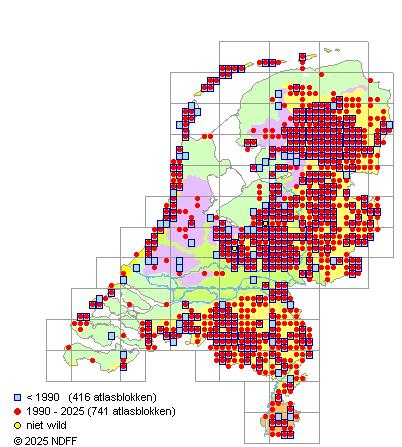 Het aantal atlasblokken (5x5 km) waarin de soort is gemeld binnen een periode van vijf jaar (vanaf 1980) of twintig jaar. Niet gecorrigeerd voor waarnemersinspanning en het aantal doorgegeven waarnemingen kan sterk variëren per periode, dus een trend in verspreiding kan hier niet direct uit worden afgelezen. Het opgegeven jaartal is het eerste jaar van de periode. Bron: gevalideerde waarnemingen uit de NDFF.