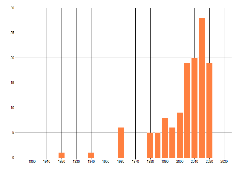 Het aantal atlasblokken (5x5 km) waarin de soort is gemeld binnen een periode van vijf jaar (vanaf 1980) of twintig jaar. Niet gecorrigeerd voor waarnemersinspanning en het aantal doorgegeven waarnemingen kan sterk variëren per periode, dus een trend in verspreiding kan hier niet direct uit worden afgelezen. Het opgegeven jaartal is het eerste jaar van de periode. Bron: gevalideerde waarnemingen uit de NDFF.