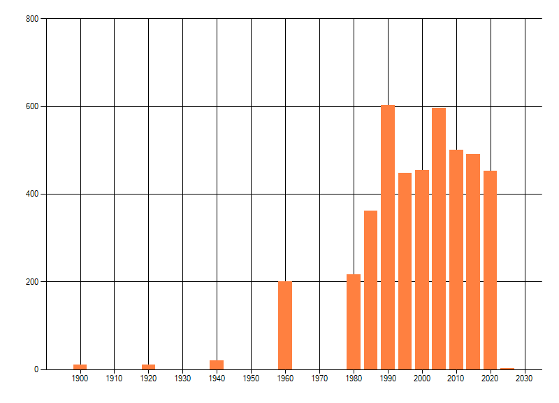 Het aantal atlasblokken (5x5 km) waarin de soort is gemeld binnen een periode van vijf jaar (vanaf 1980) of twintig jaar. Niet gecorrigeerd voor waarnemersinspanning en het aantal doorgegeven waarnemingen kan sterk variëren per periode, dus een trend in verspreiding kan hier niet direct uit worden afgelezen. Het opgegeven jaartal is het eerste jaar van de periode. Bron: gevalideerde waarnemingen uit de NDFF.