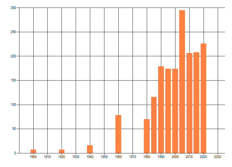 Het aantal atlasblokken (5x5 km) waarin de soort is gemeld binnen een periode van vijf jaar (vanaf 1980) of twintig jaar. Niet gecorrigeerd voor waarnemersinspanning en het aantal doorgegeven waarnemingen kan sterk variëren per periode, dus een trend in verspreiding kan hier niet direct uit worden afgelezen. Het opgegeven jaartal is het eerste jaar van de periode. Bron: gevalideerde waarnemingen uit de NDFF.