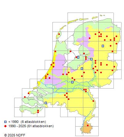 Het aantal atlasblokken (5x5 km) waarin de soort is gemeld binnen een periode van vijf jaar (vanaf 1980) of twintig jaar. Niet gecorrigeerd voor waarnemersinspanning en het aantal doorgegeven waarnemingen kan sterk variëren per periode, dus een trend in verspreiding kan hier niet direct uit worden afgelezen. Het opgegeven jaartal is het eerste jaar van de periode. Bron: gevalideerde waarnemingen uit de NDFF.