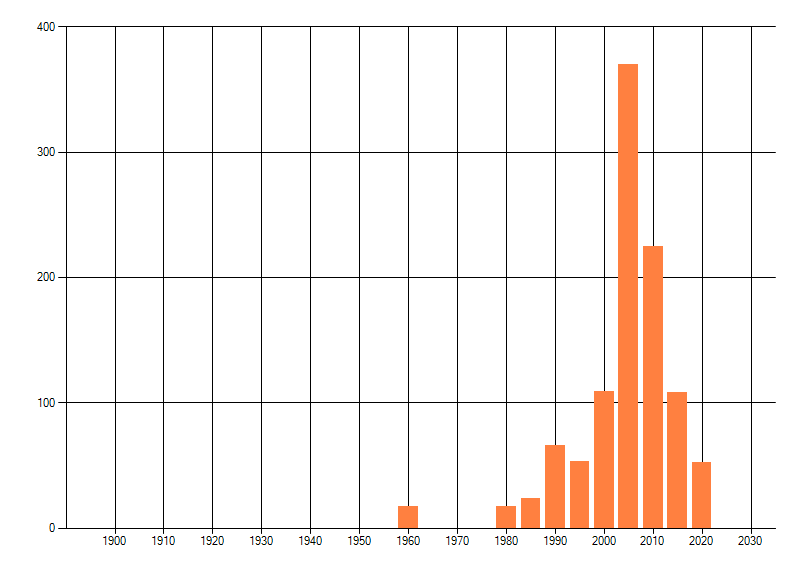 Het aantal atlasblokken (5x5 km) waarin de soort is gemeld binnen een periode van vijf jaar (vanaf 1980) of twintig jaar. Niet gecorrigeerd voor waarnemersinspanning en het aantal doorgegeven waarnemingen kan sterk variëren per periode, dus een trend in verspreiding kan hier niet direct uit worden afgelezen. Het opgegeven jaartal is het eerste jaar van de periode. Bron: gevalideerde waarnemingen uit de NDFF.