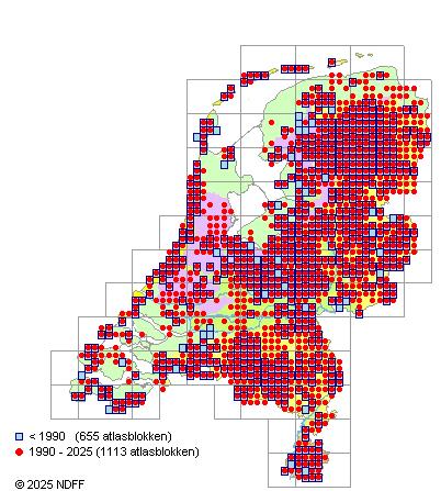 Het aantal atlasblokken (5x5 km) waarin de soort is gemeld binnen een periode van vijf jaar (vanaf 1980) of twintig jaar. Niet gecorrigeerd voor waarnemersinspanning en het aantal doorgegeven waarnemingen kan sterk variëren per periode, dus een trend in verspreiding kan hier niet direct uit worden afgelezen. Het opgegeven jaartal is het eerste jaar van de periode. Bron: gevalideerde waarnemingen uit de NDFF.