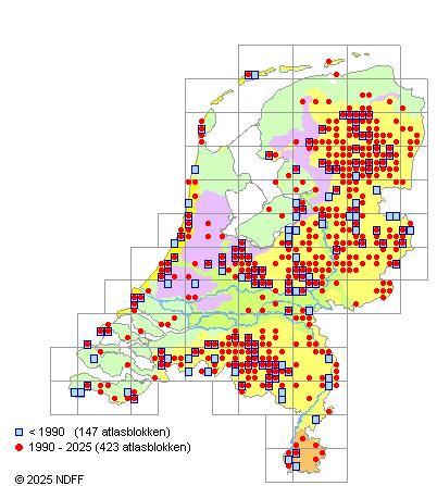 Het aantal atlasblokken (5x5 km) waarin de soort is gemeld binnen een periode van vijf jaar (vanaf 1980) of twintig jaar. Niet gecorrigeerd voor waarnemersinspanning en het aantal doorgegeven waarnemingen kan sterk variëren per periode, dus een trend in verspreiding kan hier niet direct uit worden afgelezen. Het opgegeven jaartal is het eerste jaar van de periode. Bron: gevalideerde waarnemingen uit de NDFF.