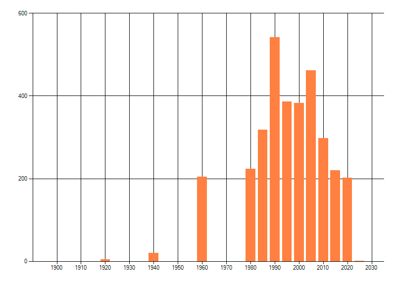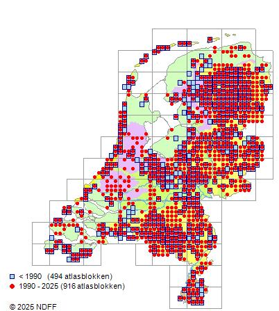 Het aantal atlasblokken (5x5 km) waarin de soort is gemeld binnen een periode van vijf jaar (vanaf 1980) of twintig jaar. Niet gecorrigeerd voor waarnemersinspanning en het aantal doorgegeven waarnemingen kan sterk variëren per periode, dus een trend in verspreiding kan hier niet direct uit worden afgelezen. Het opgegeven jaartal is het eerste jaar van de periode. Bron: gevalideerde waarnemingen uit de NDFF.