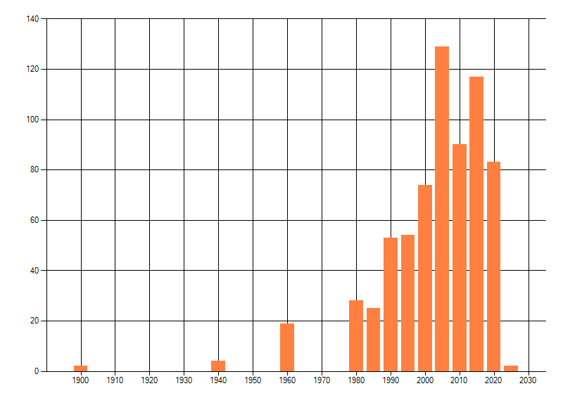 Het aantal atlasblokken (5x5 km) waarin de soort is gemeld binnen een periode van vijf jaar (vanaf 1980) of twintig jaar. Niet gecorrigeerd voor waarnemersinspanning en het aantal doorgegeven waarnemingen kan sterk variëren per periode, dus een trend in verspreiding kan hier niet direct uit worden afgelezen. Het opgegeven jaartal is het eerste jaar van de periode. Bron: gevalideerde waarnemingen uit de NDFF.