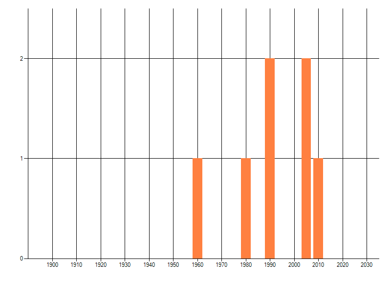 Het aantal atlasblokken (5x5 km) waarin de soort is gemeld binnen een periode van vijf jaar (vanaf 1980) of twintig jaar. Niet gecorrigeerd voor waarnemersinspanning en het aantal doorgegeven waarnemingen kan sterk variëren per periode, dus een trend in verspreiding kan hier niet direct uit worden afgelezen. Het opgegeven jaartal is het eerste jaar van de periode. Bron: gevalideerde waarnemingen uit de NDFF.