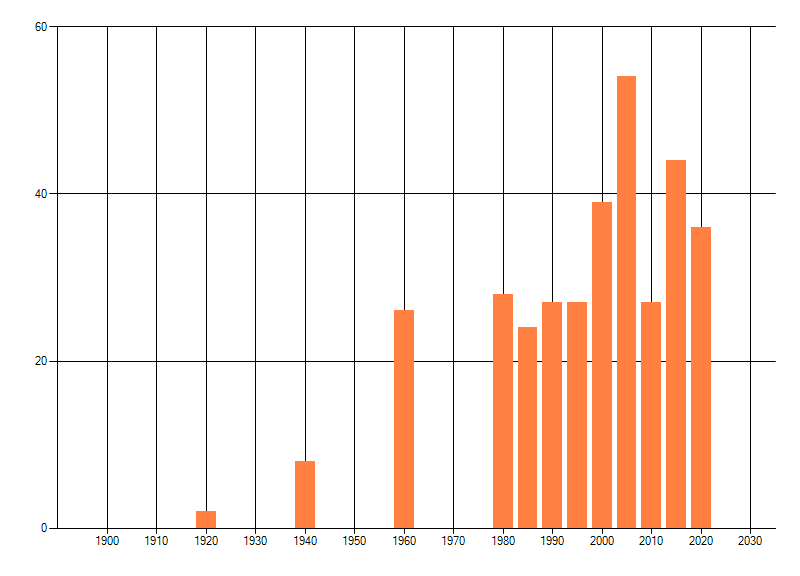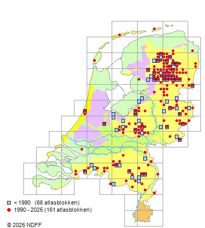 Het aantal atlasblokken (5x5 km) waarin de soort is gemeld binnen een periode van vijf jaar (vanaf 1980) of twintig jaar. Niet gecorrigeerd voor waarnemersinspanning en het aantal doorgegeven waarnemingen kan sterk variëren per periode, dus een trend in verspreiding kan hier niet direct uit worden afgelezen. Het opgegeven jaartal is het eerste jaar van de periode. Bron: gevalideerde waarnemingen uit de NDFF.