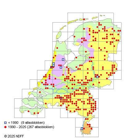 Het aantal atlasblokken (5x5 km) waarin de soort is gemeld binnen een periode van vijf jaar (vanaf 1980) of twintig jaar. Niet gecorrigeerd voor waarnemersinspanning en het aantal doorgegeven waarnemingen kan sterk variëren per periode, dus een trend in verspreiding kan hier niet direct uit worden afgelezen. Het opgegeven jaartal is het eerste jaar van de periode. Bron: gevalideerde waarnemingen uit de NDFF.
