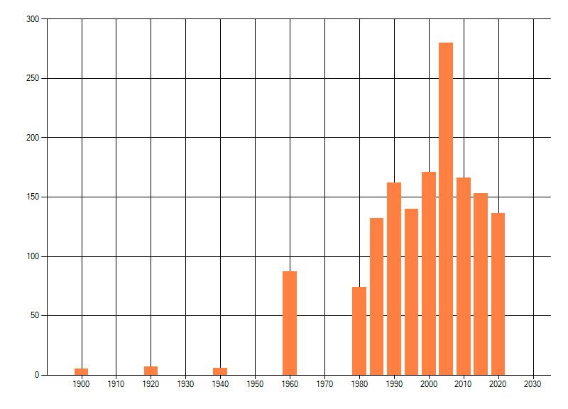 Het aantal atlasblokken (5x5 km) waarin de soort is gemeld binnen een periode van vijf jaar (vanaf 1980) of twintig jaar. Niet gecorrigeerd voor waarnemersinspanning en het aantal doorgegeven waarnemingen kan sterk variëren per periode, dus een trend in verspreiding kan hier niet direct uit worden afgelezen. Het opgegeven jaartal is het eerste jaar van de periode. Bron: gevalideerde waarnemingen uit de NDFF.