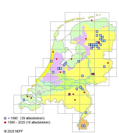 Het aantal atlasblokken (5x5 km) waarin de soort is gemeld binnen een periode van vijf jaar (vanaf 1980) of twintig jaar. Niet gecorrigeerd voor waarnemersinspanning en het aantal doorgegeven waarnemingen kan sterk variëren per periode, dus een trend in verspreiding kan hier niet direct uit worden afgelezen. Het opgegeven jaartal is het eerste jaar van de periode. Bron: gevalideerde waarnemingen uit de NDFF.