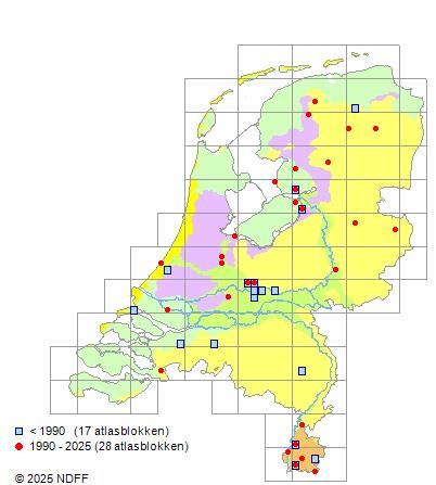 Het aantal atlasblokken (5x5 km) waarin de soort is gemeld binnen een periode van vijf jaar (vanaf 1980) of twintig jaar. Niet gecorrigeerd voor waarnemersinspanning en het aantal doorgegeven waarnemingen kan sterk variëren per periode, dus een trend in verspreiding kan hier niet direct uit worden afgelezen. Het opgegeven jaartal is het eerste jaar van de periode. Bron: gevalideerde waarnemingen uit de NDFF.