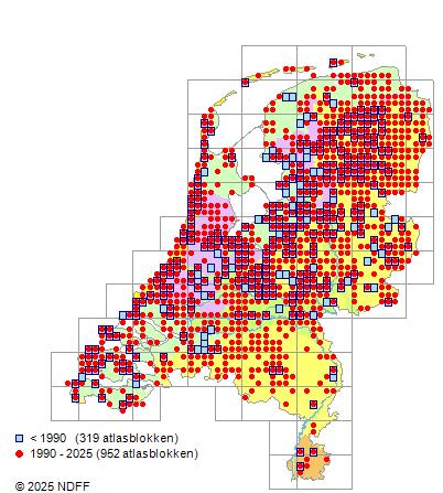 Het aantal atlasblokken (5x5 km) waarin de soort is gemeld binnen een periode van vijf jaar (vanaf 1980) of twintig jaar. Niet gecorrigeerd voor waarnemersinspanning en het aantal doorgegeven waarnemingen kan sterk variëren per periode, dus een trend in verspreiding kan hier niet direct uit worden afgelezen. Het opgegeven jaartal is het eerste jaar van de periode. Bron: gevalideerde waarnemingen uit de NDFF.
