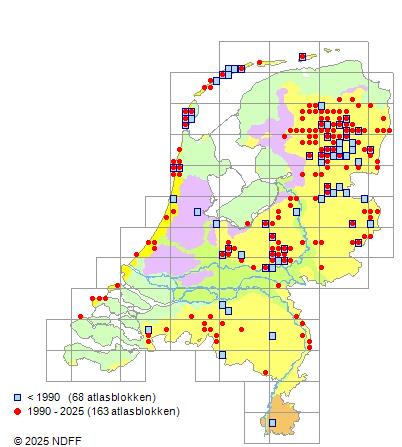 Het aantal atlasblokken (5x5 km) waarin de soort is gemeld binnen een periode van vijf jaar (vanaf 1980) of twintig jaar. Niet gecorrigeerd voor waarnemersinspanning en het aantal doorgegeven waarnemingen kan sterk variëren per periode, dus een trend in verspreiding kan hier niet direct uit worden afgelezen. Het opgegeven jaartal is het eerste jaar van de periode. Bron: gevalideerde waarnemingen uit de NDFF.