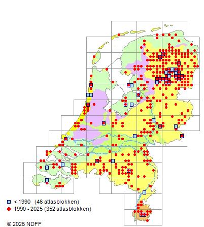 Het aantal atlasblokken (5x5 km) waarin de soort is gemeld binnen een periode van vijf jaar (vanaf 1980) of twintig jaar. Niet gecorrigeerd voor waarnemersinspanning en het aantal doorgegeven waarnemingen kan sterk variëren per periode, dus een trend in verspreiding kan hier niet direct uit worden afgelezen. Het opgegeven jaartal is het eerste jaar van de periode. Bron: gevalideerde waarnemingen uit de NDFF.