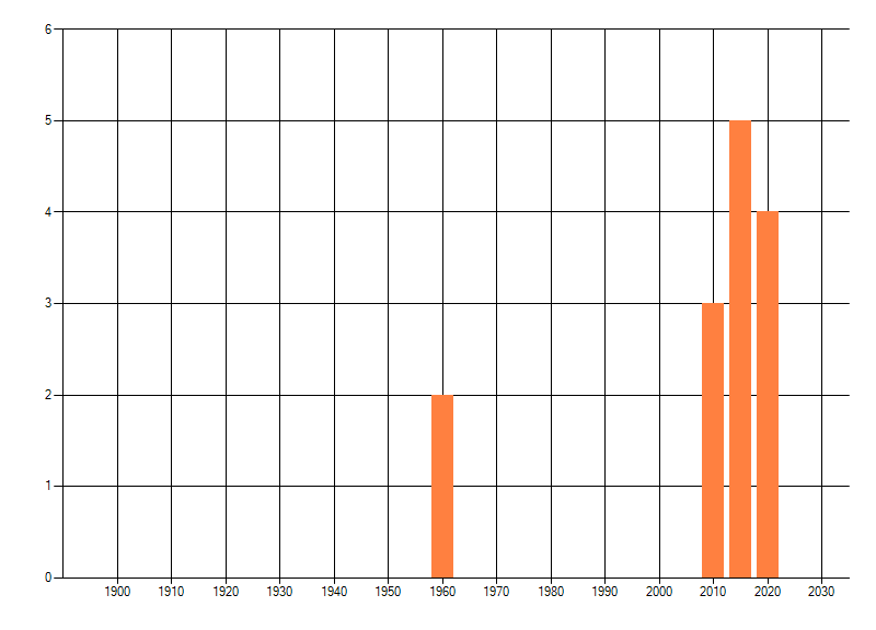 Het aantal atlasblokken (5x5 km) waarin de soort is gemeld binnen een periode van vijf jaar (vanaf 1980) of twintig jaar. Niet gecorrigeerd voor waarnemersinspanning en het aantal doorgegeven waarnemingen kan sterk variëren per periode, dus een trend in verspreiding kan hier niet direct uit worden afgelezen. Het opgegeven jaartal is het eerste jaar van de periode. Bron: gevalideerde waarnemingen uit de NDFF.