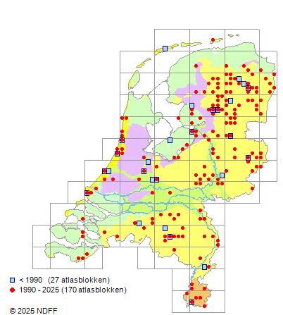 Het aantal atlasblokken (5x5 km) waarin de soort is gemeld binnen een periode van vijf jaar (vanaf 1980) of twintig jaar. Niet gecorrigeerd voor waarnemersinspanning en het aantal doorgegeven waarnemingen kan sterk variëren per periode, dus een trend in verspreiding kan hier niet direct uit worden afgelezen. Het opgegeven jaartal is het eerste jaar van de periode. Bron: gevalideerde waarnemingen uit de NDFF.