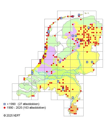 Het aantal atlasblokken (5x5 km) waarin de soort is gemeld binnen een periode van vijf jaar (vanaf 1980) of twintig jaar. Niet gecorrigeerd voor waarnemersinspanning en het aantal doorgegeven waarnemingen kan sterk variëren per periode, dus een trend in verspreiding kan hier niet direct uit worden afgelezen. Het opgegeven jaartal is het eerste jaar van de periode. Bron: gevalideerde waarnemingen uit de NDFF.