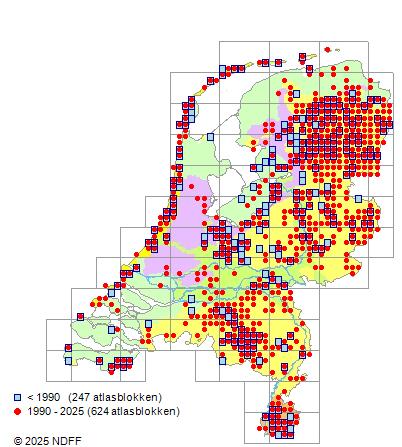 Het aantal atlasblokken (5x5 km) waarin de soort is gemeld binnen een periode van vijf jaar (vanaf 1980) of twintig jaar. Niet gecorrigeerd voor waarnemersinspanning en het aantal doorgegeven waarnemingen kan sterk variëren per periode, dus een trend in verspreiding kan hier niet direct uit worden afgelezen. Het opgegeven jaartal is het eerste jaar van de periode. Bron: gevalideerde waarnemingen uit de NDFF.