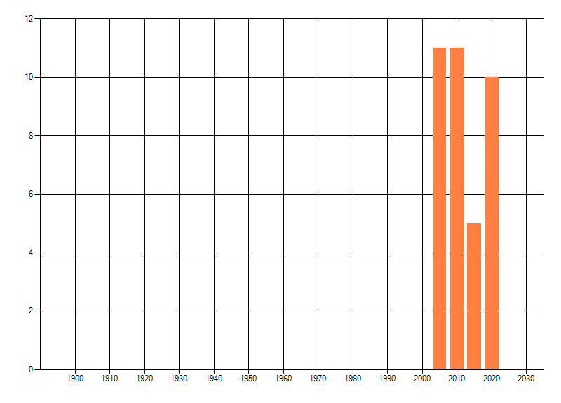Het aantal atlasblokken (5x5 km) waarin de soort is gemeld binnen een periode van vijf jaar (vanaf 1980) of twintig jaar. Niet gecorrigeerd voor waarnemersinspanning en het aantal doorgegeven waarnemingen kan sterk variëren per periode, dus een trend in verspreiding kan hier niet direct uit worden afgelezen. Het opgegeven jaartal is het eerste jaar van de periode. Bron: gevalideerde waarnemingen uit de NDFF.