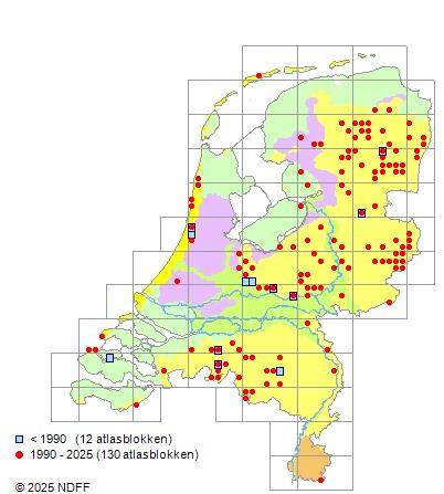 Het aantal atlasblokken (5x5 km) waarin de soort is gemeld binnen een periode van vijf jaar (vanaf 1980) of twintig jaar. Niet gecorrigeerd voor waarnemersinspanning en het aantal doorgegeven waarnemingen kan sterk variëren per periode, dus een trend in verspreiding kan hier niet direct uit worden afgelezen. Het opgegeven jaartal is het eerste jaar van de periode. Bron: gevalideerde waarnemingen uit de NDFF.
