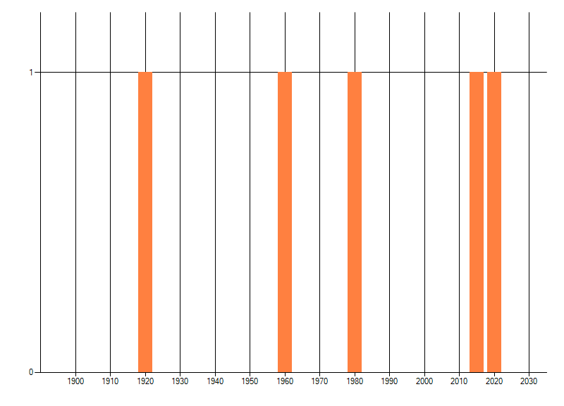 Het aantal atlasblokken (5x5 km) waarin de soort is gemeld binnen een periode van vijf jaar (vanaf 1980) of twintig jaar. Niet gecorrigeerd voor waarnemersinspanning en het aantal doorgegeven waarnemingen kan sterk variëren per periode, dus een trend in verspreiding kan hier niet direct uit worden afgelezen. Het opgegeven jaartal is het eerste jaar van de periode. Bron: gevalideerde waarnemingen uit de NDFF.