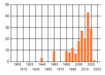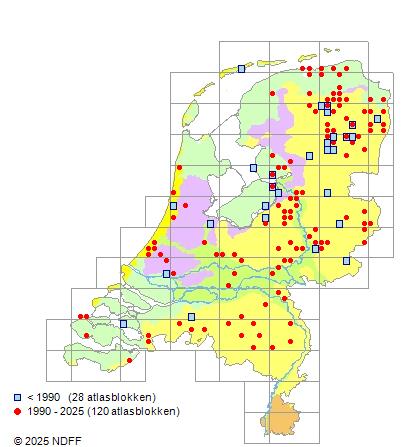 Het aantal atlasblokken (5x5 km) waarin de soort is gemeld binnen een periode van vijf jaar (vanaf 1980) of twintig jaar. Niet gecorrigeerd voor waarnemersinspanning en het aantal doorgegeven waarnemingen kan sterk variëren per periode, dus een trend in verspreiding kan hier niet direct uit worden afgelezen. Het opgegeven jaartal is het eerste jaar van de periode. Bron: gevalideerde waarnemingen uit de NDFF.