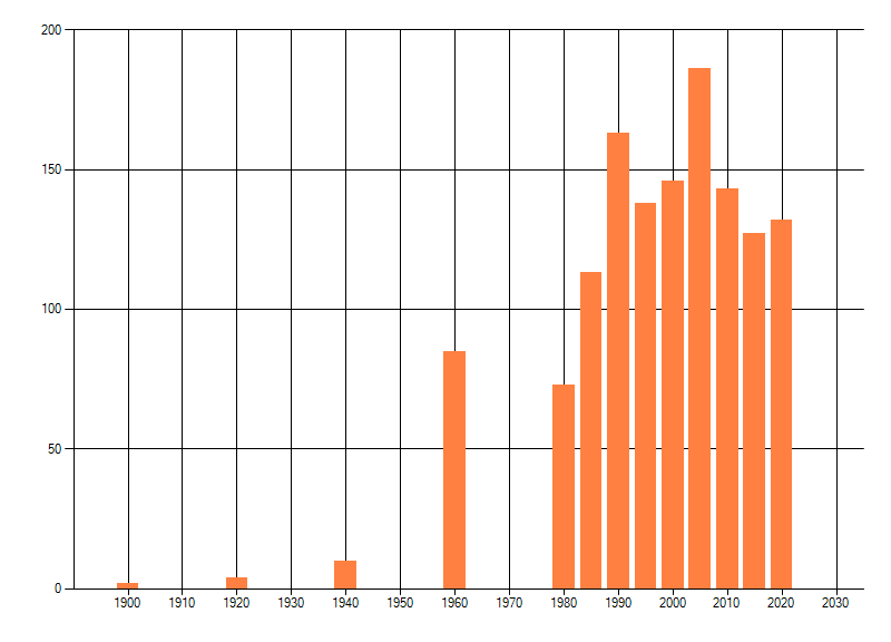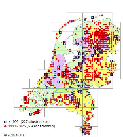 Het aantal atlasblokken (5x5 km) waarin de soort is gemeld binnen een periode van vijf jaar (vanaf 1980) of twintig jaar. Niet gecorrigeerd voor waarnemersinspanning en het aantal doorgegeven waarnemingen kan sterk variëren per periode, dus een trend in verspreiding kan hier niet direct uit worden afgelezen. Het opgegeven jaartal is het eerste jaar van de periode. Bron: gevalideerde waarnemingen uit de NDFF.