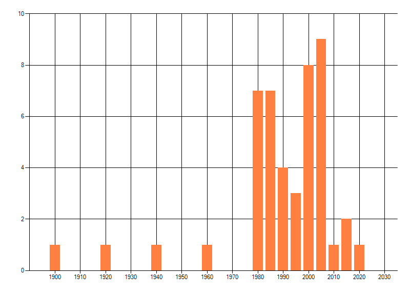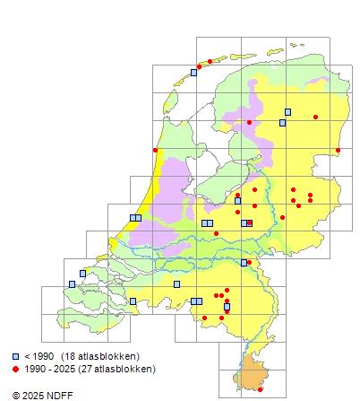 Het aantal atlasblokken (5x5 km) waarin de soort is gemeld binnen een periode van vijf jaar (vanaf 1980) of twintig jaar. Niet gecorrigeerd voor waarnemersinspanning en het aantal doorgegeven waarnemingen kan sterk variëren per periode, dus een trend in verspreiding kan hier niet direct uit worden afgelezen. Het opgegeven jaartal is het eerste jaar van de periode. Bron: gevalideerde waarnemingen uit de NDFF.