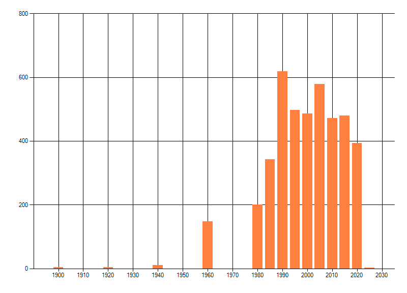 Het aantal atlasblokken (5x5 km) waarin de soort is gemeld binnen een periode van vijf jaar (vanaf 1980) of twintig jaar. Niet gecorrigeerd voor waarnemersinspanning en het aantal doorgegeven waarnemingen kan sterk variëren per periode, dus een trend in verspreiding kan hier niet direct uit worden afgelezen. Het opgegeven jaartal is het eerste jaar van de periode. Bron: gevalideerde waarnemingen uit de NDFF.