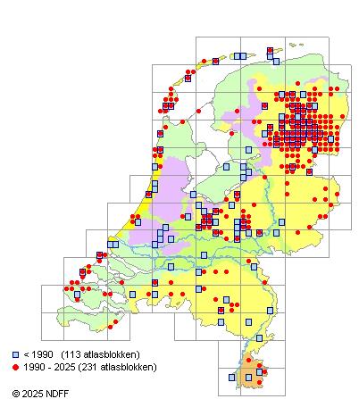 Het aantal atlasblokken (5x5 km) waarin de soort is gemeld binnen een periode van vijf jaar (vanaf 1980) of twintig jaar. Niet gecorrigeerd voor waarnemersinspanning en het aantal doorgegeven waarnemingen kan sterk variëren per periode, dus een trend in verspreiding kan hier niet direct uit worden afgelezen. Het opgegeven jaartal is het eerste jaar van de periode. Bron: gevalideerde waarnemingen uit de NDFF.