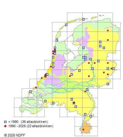 Het aantal atlasblokken (5x5 km) waarin de soort is gemeld binnen een periode van vijf jaar (vanaf 1980) of twintig jaar. Niet gecorrigeerd voor waarnemersinspanning en het aantal doorgegeven waarnemingen kan sterk variëren per periode, dus een trend in verspreiding kan hier niet direct uit worden afgelezen. Het opgegeven jaartal is het eerste jaar van de periode. Bron: gevalideerde waarnemingen uit de NDFF.