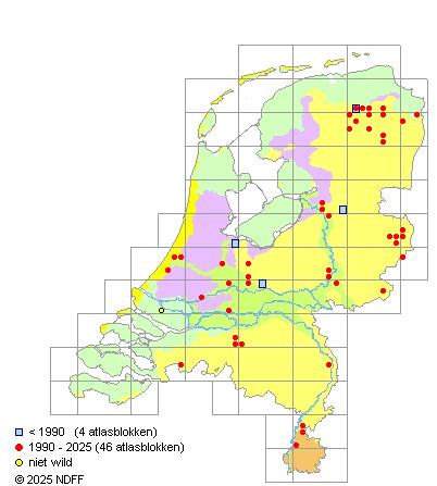 Het aantal atlasblokken (5x5 km) waarin de soort is gemeld binnen een periode van vijf jaar (vanaf 1980) of twintig jaar. Niet gecorrigeerd voor waarnemersinspanning en het aantal doorgegeven waarnemingen kan sterk variëren per periode, dus een trend in verspreiding kan hier niet direct uit worden afgelezen. Het opgegeven jaartal is het eerste jaar van de periode. Bron: gevalideerde waarnemingen uit de NDFF.