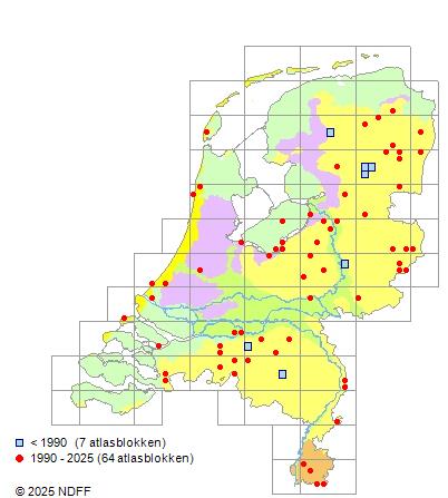 Het aantal atlasblokken (5x5 km) waarin de soort is gemeld binnen een periode van vijf jaar (vanaf 1980) of twintig jaar. Niet gecorrigeerd voor waarnemersinspanning en het aantal doorgegeven waarnemingen kan sterk variëren per periode, dus een trend in verspreiding kan hier niet direct uit worden afgelezen. Het opgegeven jaartal is het eerste jaar van de periode. Bron: gevalideerde waarnemingen uit de NDFF.