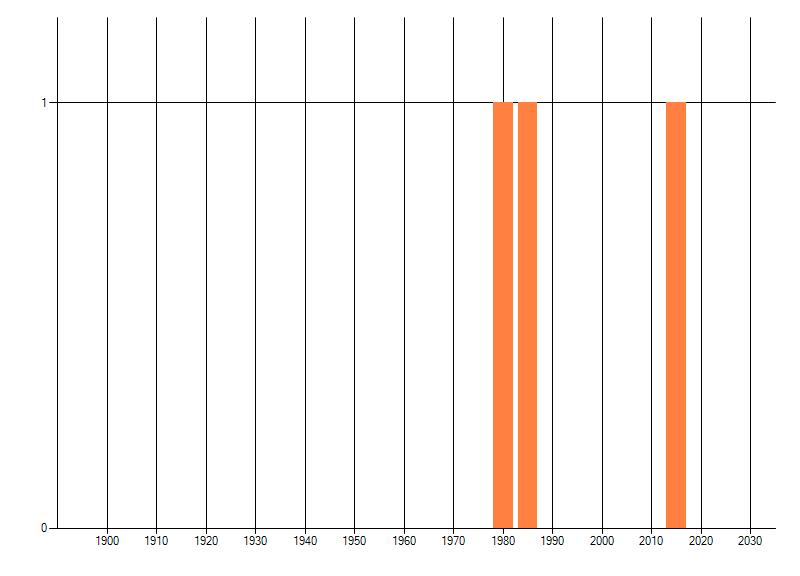 Het aantal atlasblokken (5x5 km) waarin de soort is gemeld binnen een periode van vijf jaar (vanaf 1980) of twintig jaar. Niet gecorrigeerd voor waarnemersinspanning en het aantal doorgegeven waarnemingen kan sterk variëren per periode, dus een trend in verspreiding kan hier niet direct uit worden afgelezen. Het opgegeven jaartal is het eerste jaar van de periode. Bron: gevalideerde waarnemingen uit de NDFF.