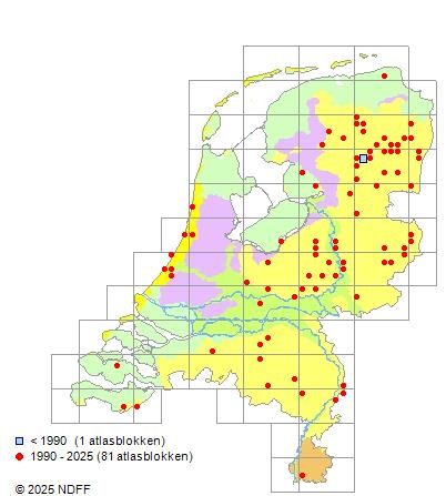 Het aantal atlasblokken (5x5 km) waarin de soort is gemeld binnen een periode van vijf jaar (vanaf 1980) of twintig jaar. Niet gecorrigeerd voor waarnemersinspanning en het aantal doorgegeven waarnemingen kan sterk variëren per periode, dus een trend in verspreiding kan hier niet direct uit worden afgelezen. Het opgegeven jaartal is het eerste jaar van de periode. Bron: gevalideerde waarnemingen uit de NDFF.