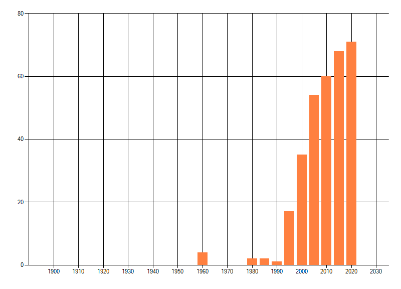 Het aantal atlasblokken (5x5 km) waarin de soort is gemeld binnen een periode van vijf jaar (vanaf 1980) of twintig jaar. Niet gecorrigeerd voor waarnemersinspanning en het aantal doorgegeven waarnemingen kan sterk variëren per periode, dus een trend in verspreiding kan hier niet direct uit worden afgelezen. Het opgegeven jaartal is het eerste jaar van de periode. Bron: gevalideerde waarnemingen uit de NDFF.