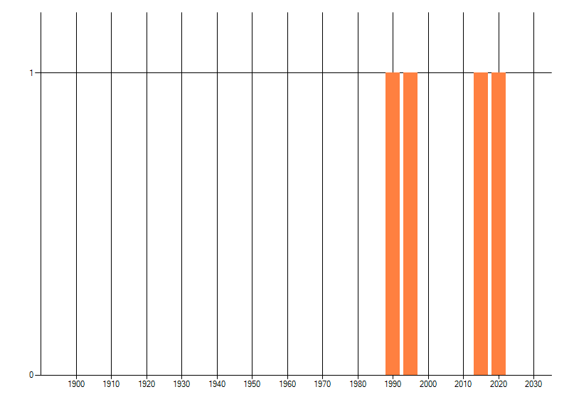 Het aantal atlasblokken (5x5 km) waarin de soort is gemeld binnen een periode van vijf jaar (vanaf 1980) of twintig jaar. Niet gecorrigeerd voor waarnemersinspanning en het aantal doorgegeven waarnemingen kan sterk variëren per periode, dus een trend in verspreiding kan hier niet direct uit worden afgelezen. Het opgegeven jaartal is het eerste jaar van de periode. Bron: gevalideerde waarnemingen uit de NDFF.