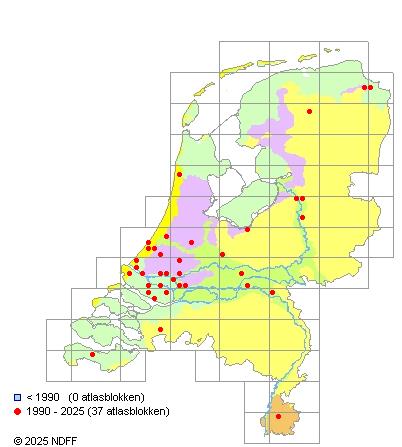 Het aantal atlasblokken (5x5 km) waarin de soort is gemeld binnen een periode van vijf jaar (vanaf 1980) of twintig jaar. Niet gecorrigeerd voor waarnemersinspanning en het aantal doorgegeven waarnemingen kan sterk variëren per periode, dus een trend in verspreiding kan hier niet direct uit worden afgelezen. Het opgegeven jaartal is het eerste jaar van de periode. Bron: gevalideerde waarnemingen uit de NDFF.