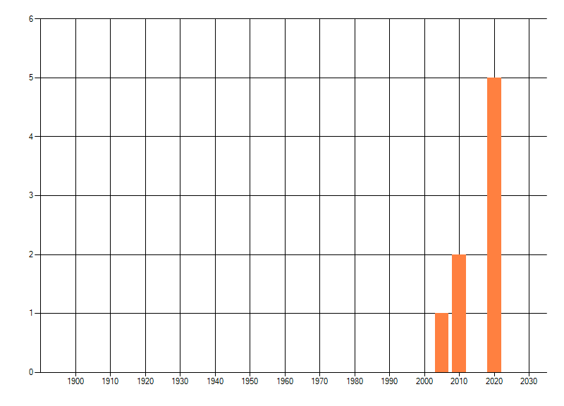 Het aantal atlasblokken (5x5 km) waarin de soort is gemeld binnen een periode van vijf jaar (vanaf 1980) of twintig jaar. Niet gecorrigeerd voor waarnemersinspanning en het aantal doorgegeven waarnemingen kan sterk variëren per periode, dus een trend in verspreiding kan hier niet direct uit worden afgelezen. Het opgegeven jaartal is het eerste jaar van de periode. Bron: gevalideerde waarnemingen uit de NDFF.