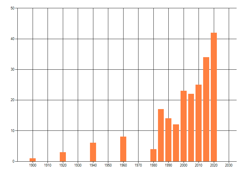Het aantal atlasblokken (5x5 km) waarin de soort is gemeld binnen een periode van vijf jaar (vanaf 1980) of twintig jaar. Niet gecorrigeerd voor waarnemersinspanning en het aantal doorgegeven waarnemingen kan sterk variëren per periode, dus een trend in verspreiding kan hier niet direct uit worden afgelezen. Het opgegeven jaartal is het eerste jaar van de periode. Bron: gevalideerde waarnemingen uit de NDFF.