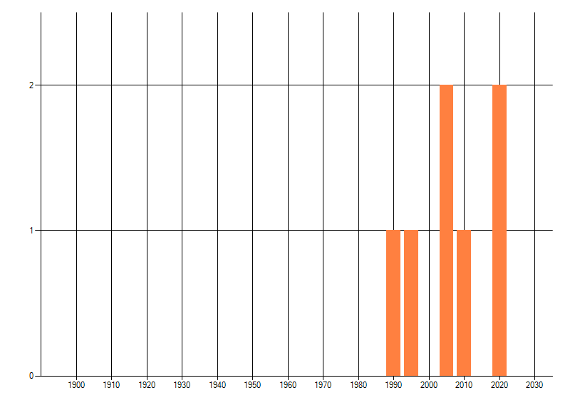 Het aantal atlasblokken (5x5 km) waarin de soort is gemeld binnen een periode van vijf jaar (vanaf 1980) of twintig jaar. Niet gecorrigeerd voor waarnemersinspanning en het aantal doorgegeven waarnemingen kan sterk variëren per periode, dus een trend in verspreiding kan hier niet direct uit worden afgelezen. Het opgegeven jaartal is het eerste jaar van de periode. Bron: gevalideerde waarnemingen uit de NDFF.