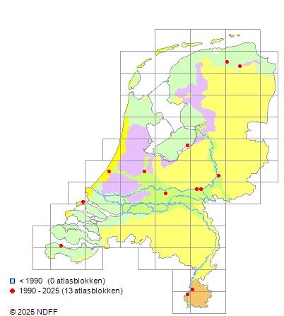 Het aantal atlasblokken (5x5 km) waarin de soort is gemeld binnen een periode van vijf jaar (vanaf 1980) of twintig jaar. Niet gecorrigeerd voor waarnemersinspanning en het aantal doorgegeven waarnemingen kan sterk variëren per periode, dus een trend in verspreiding kan hier niet direct uit worden afgelezen. Het opgegeven jaartal is het eerste jaar van de periode. Bron: gevalideerde waarnemingen uit de NDFF.