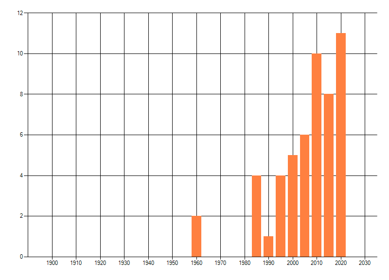 Het aantal atlasblokken (5x5 km) waarin de soort is gemeld binnen een periode van vijf jaar (vanaf 1980) of twintig jaar. Niet gecorrigeerd voor waarnemersinspanning en het aantal doorgegeven waarnemingen kan sterk variëren per periode, dus een trend in verspreiding kan hier niet direct uit worden afgelezen. Het opgegeven jaartal is het eerste jaar van de periode. Bron: gevalideerde waarnemingen uit de NDFF.