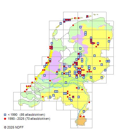 Het aantal atlasblokken (5x5 km) waarin de soort is gemeld binnen een periode van vijf jaar (vanaf 1980) of twintig jaar. Niet gecorrigeerd voor waarnemersinspanning en het aantal doorgegeven waarnemingen kan sterk variëren per periode, dus een trend in verspreiding kan hier niet direct uit worden afgelezen. Het opgegeven jaartal is het eerste jaar van de periode. Bron: gevalideerde waarnemingen uit de NDFF.